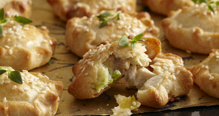 - Bring up the pastry borders and pinch into the top pastry to form a seal, brush again with beaten egg glaze. Make two small steam holes in the top of each pie and bake for 18 – 20 minutes until pastry golden brown. Sprinkle with sesame seeds and a little thyme and serve.