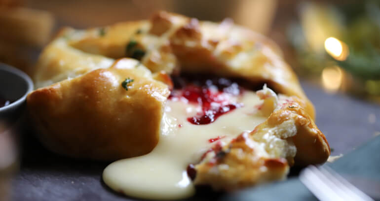 - Place the camembert in the centre of the croissant square and spoon the cranberry sauce on top of the camembert.